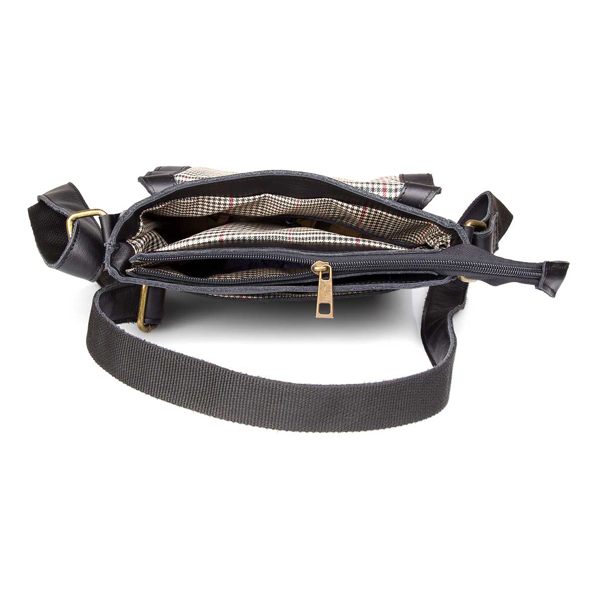Ha due tasche, di cui una con chiusura lampo e soffietto per dare maggiore ampiezza e capacità con all’interno due taschini liberi di diverse dimensioni.