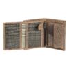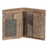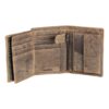 La vera particolarità è la linguetta a bottone che, nella parte sinistra del portafoglio, rivela due tasche a retina e otto porta card.