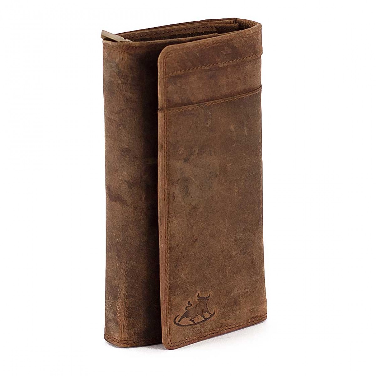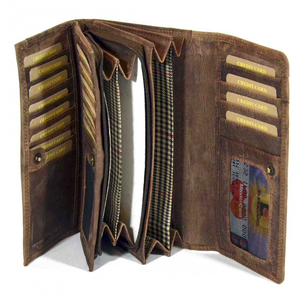 Ampio portafoglio da donna in cuoio spazzolato a mano, dotato di scomparto per 15 carte di credito più altri 5 spazi sul retro della patta.
