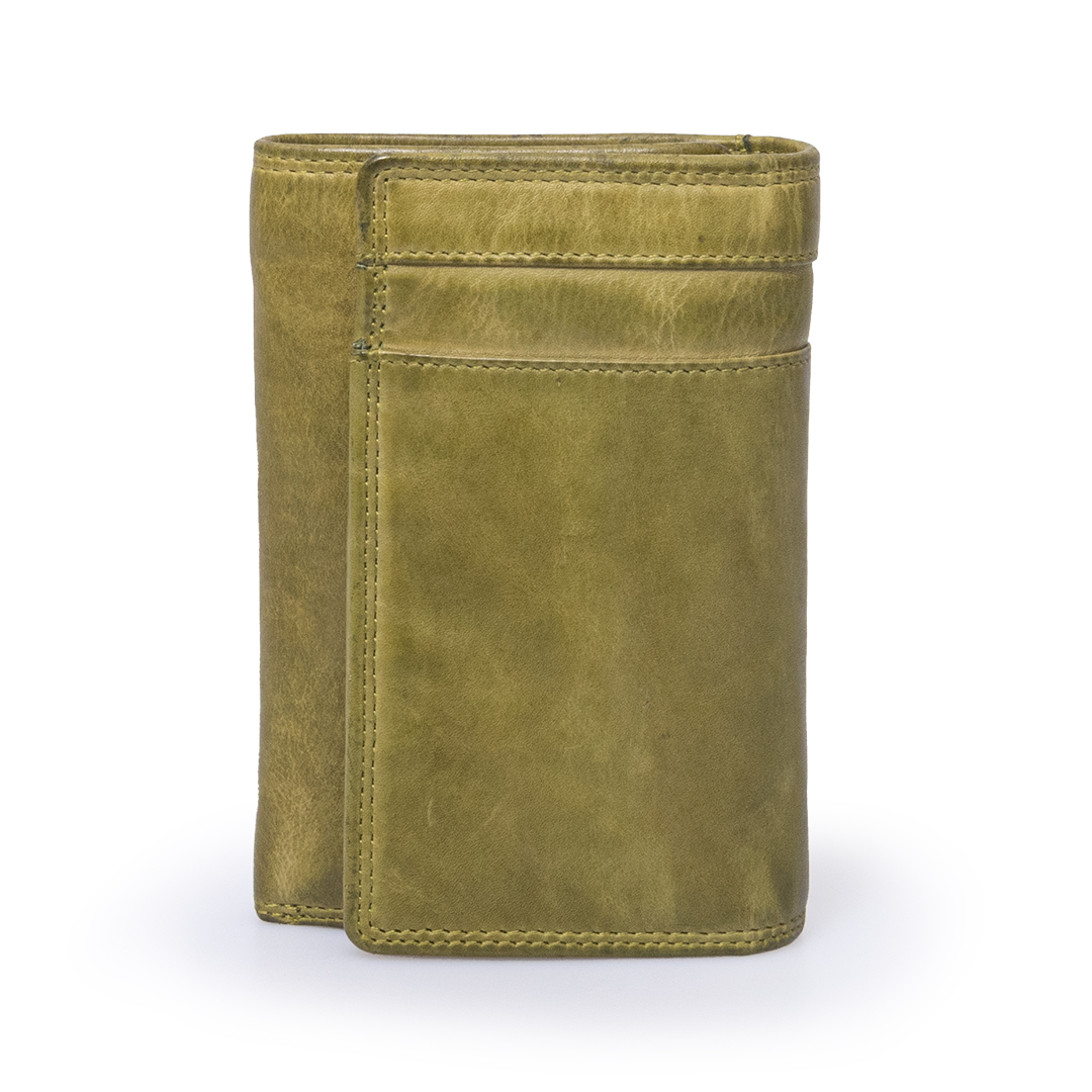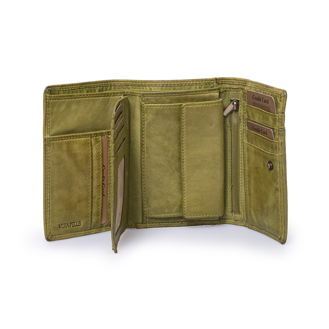 Portafoglio realizzato in morbida e pregiata pelle con finitura “lavata”. Chiusura in 3 lembi, doppio scomparto per le banconote, portamonete classico al centro. Pattina per i documenti e le schede. E’ il classico portafoglio per la signora ma reso innovativo dal colore di tendenza.